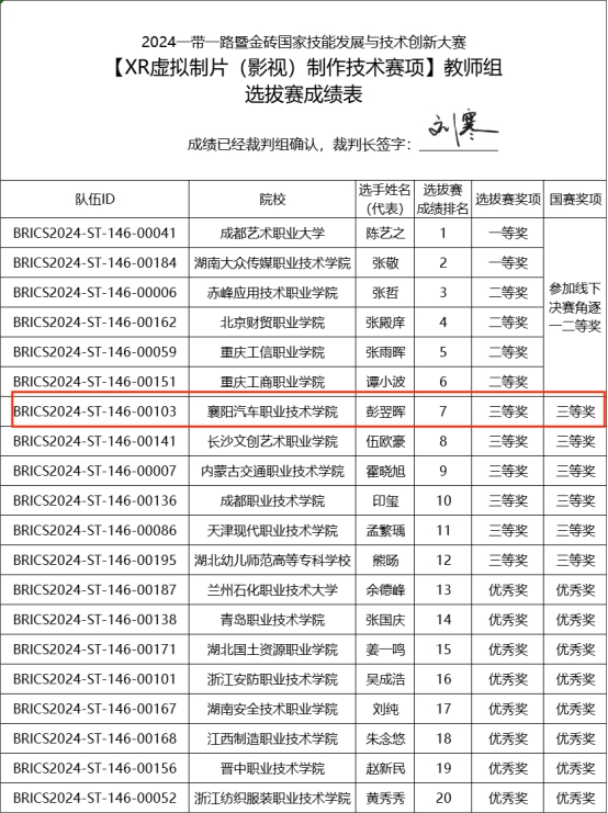 10月27日,2024“一带一路”暨金砖国家技能发展与技术创新大赛“XR虚拟制片(影视)制作技术”赛项全国选拔赛在线上成功举办。在与来自全国各地的20支参赛队伍同台竞技中,信息技术学院虚拟现实技术应用专业教师张梦帆、彭翌晖、卓韵荆团队荣获三等奖。