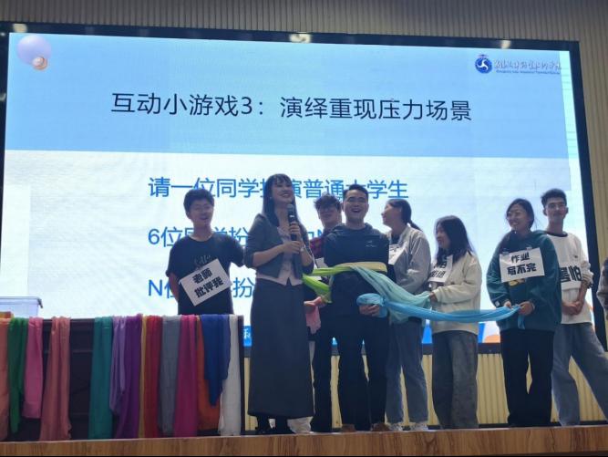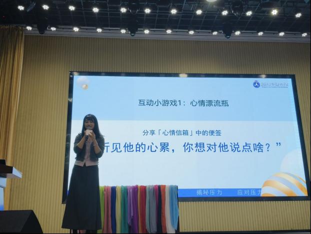 随后,贾玥蕾老师通过三个互动小游戏:心情漂流瓶、压力吹气球、演绎重现压力场景。让大家直观地感受到了自己的心理压力水平,在老师的引导下,大家纷纷敞开心扉,主动分享了各自的减压方法和应对方式,积极引导大家直面压力、了解压力、战胜压力。现场气氛热烈、掌声不断,大家笑容满面、受益良多。