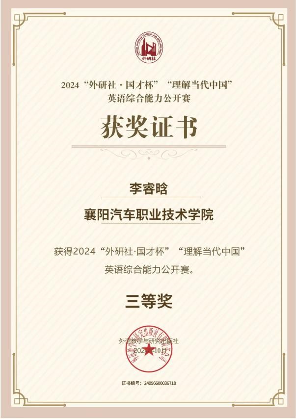 据悉,此项赛事旨在通过英语综合能力竞赛的形式,推动学生深入理解当代中国,提高英语应用能力。李睿晗同学能够在众多参赛者中崭露头角,离不开交管学院浓厚的学习氛围和助力学生成长工程的深入落实。