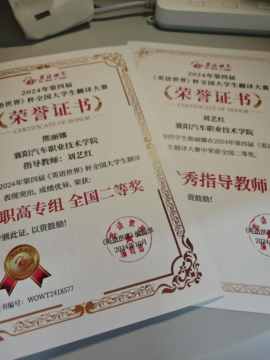 近日,在备受瞩目的《英语世界》全国大学生翻译大赛中,我校空乘2402班熊丽娜译文精准流畅,展现了对原语言的深刻理解和目标语言的灵活运用,凭借扎实的语言功底和出色的翻译技巧,在众多参赛者中脱颖而出,取得了全国二等奖的优异成绩。空乘2404班李睿晗和空乘2402班张新岚同学也不逊色,均获得全国三等奖。我校刘艺红老师获优秀指导教师荣誉称号。