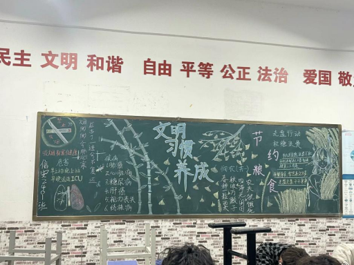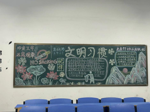 各班围绕文明校园、文明生活等主题,进行“节约粮食”“禁止吸烟”“文明习惯、文明礼仪伴我行”黑板报评比活动,用独特的艺术视角展现了文明的多元魅力。让每一面墙壁都成为文明的传播者,让每一个班级都充满文明的氛围,使文明之风吹遍校园的每一个角落。