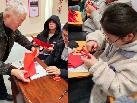 “一剪裁开汉江月,千叠纸浪涌古城”。随后,剪纸非遗传承人移步台前,以现场授课的方式,倾囊相授剪纸这门指尖艺术,开启了一场生动的技艺传承之旅。从纸张的折叠到剪刀的游走,每一个动作都蕴含着千锤百炼的功力。传承人强调,剪纸不仅仅是一种技艺,更是耐心、细心与恒心的融合,是对传统文化敬畏之心的体现。同学们在传承人的指导下,亲手操剪实践。在这一过程中,他们遇到了纸张破裂、图案走样等困难,但在传承人的鼓励下,不断尝试、调整。从简单的几何图形到复杂的蝴蝶造型,同学们逐渐掌握了剪纸的技巧。这不仅是技艺的学习,更是匠心精神的传承。在反复雕琢图案的过程中,同学们体会到了传统手工艺人对完美的执着追求,领悟到在当今快节奏的社会中,这种专注、坚守的精神对于个人成长与社会发展的重要价值,从而在心中种下了坚守与传承的种子。
