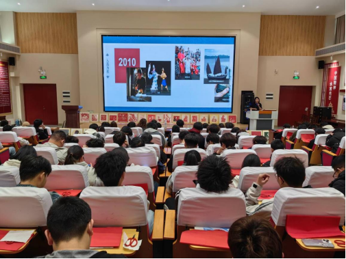“黑暗传奇襄地启,千秋文脉韵中存”。开场之际,襄阳市非物质文化遗产保护中心主任和琼率先登台,带来《与你襄遇》——“非遗襄阳之我们的非遗”主题讲座,引领众人深入探寻本土非遗的独特魅力。和琼主任集深厚学术素养与丰富实践经验于一身,其在非遗研究领域的诸多成果,为解读襄阳非遗提供了坚实支撑。讲座中,和琼主任从历史的纵轴与文化的横轴出发,剖析襄阳非遗。她指出,襄阳非遗不仅是传统技艺的延续,更是地域文明的活态呈现。以老河口木版年画为例,其独特的雕刻技法与丰富的民俗寓意,是农耕文明时期人们对美好生活向往的视觉化表达,反映了当时社会的价值取向与审美观念。而襄阳剪纸,作为民间艺术的瑰宝,在不同历史阶段不断演变,从最初的祈福辟邪功能,到如今成为传递情感、承载记忆的文化载体,其发展历程与襄阳的社会变迁息息相关。通过对这些非遗项目的解读,同学们领悟到襄阳非遗是地域文化基因的携带者,是民族精神在地方层面的生动彰显,从而深刻理解文化传承对于维系民族认同、增强文化自信的重要意义。