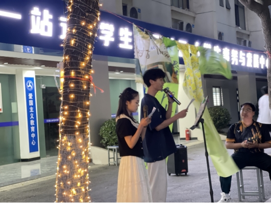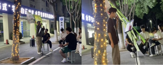 活动接近尾声,两位男生带来的合唱表演为音乐环节画上圆满句号,而书籍漂流角的设立则为书香传递搭建了长效平台。同学们纷纷将自己的书籍放入漂流角,期待着与更多爱书人共享阅读的喜悦。这场在社区门口举办的“树下悦享会”,不仅是青春热情的肆意释放,更是集体协作与知识共享的温暖见证。身着红马甲的校学生会成员用细致服务筑牢活动后盾;舞台上放声高歌、分享感悟的同学,以灵动音符和真挚话语点亮夜空;观众席此起彼伏的欢呼与热烈的交流,似浪潮般将氛围推向高潮。