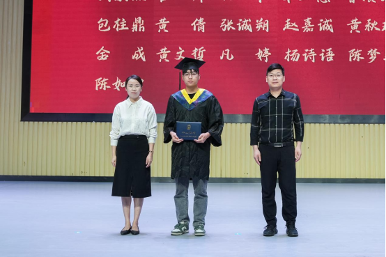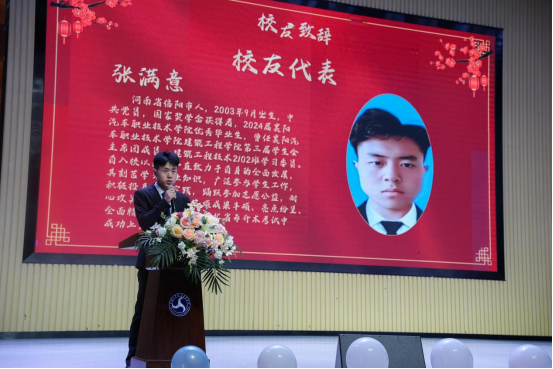 毕业生代表发言环节中,优秀校友代表张满意同学上台发言。在校期间身兼第三届学生会主席、国家奖学金获得者等多重身份的他,以真挚的情感回溯在校时光。从专业课堂的知识汲取,到学生会工作的历练成长,张满意用一个个鲜活的故事,展现校园生活的丰富图景,字里行间满溢着对母校、师长与同窗的深切感恩。发言尾声,他以学长身份寄语在场同学,鼓励大家永葆积极进取之心,在未来勇敢奔赴理想山海。