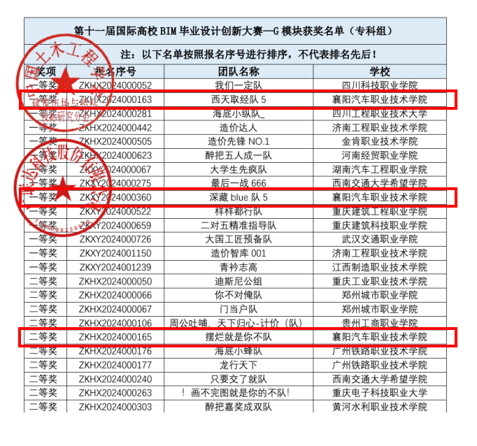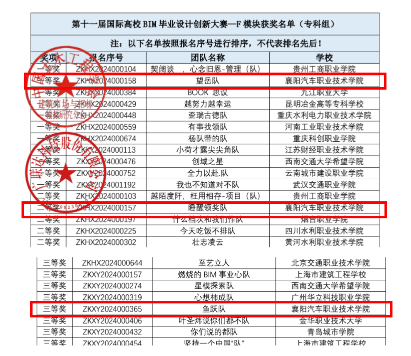 2025年5月21日,第十一届国际高校BIM毕业设计创新大赛获奖结果正式公布。襄阳汽车职业技术学院建筑工程学院共有9支参赛队伍入围全国总决赛,在BIM+工程项目管理应用、BIM+全过程造价管理与应用、施工深化设计建模与应用、道桥设计BIM应用与建模四个模块的激烈角逐中表现优异,最终斩获全国一等奖3项、二等奖3项、三等奖3项,较2023年、2024年一等奖1项,有较大突破,展现了学校在建筑信息化与智能化领域的教学实力与学生的创新能力。