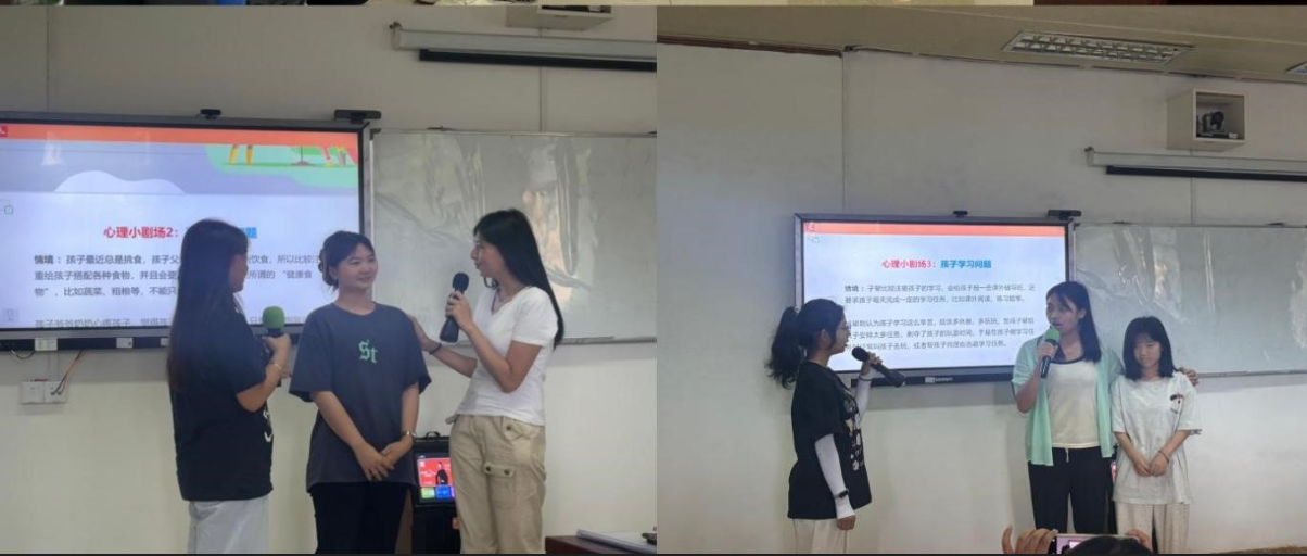 随后,“襄汽暖阳心理志愿服务队”的同学们通过三个生动的心理情景剧,真实再现了隔代抚养中的典型矛盾:情景剧1《过度保护》展现了祖辈包办代劳与孩子自主成长的冲突;情景剧2《餐桌上的拉锯战》反映了祖辈与子女在孩子习惯养成上的分歧;情景剧3《学习之争》则呈现了教育理念的代际差异。这些贴近生活的演绎引起了在场几十余位祖辈家长的强烈共鸣,也引发了大家对隔代抚养问题的深入思考。通过情景剧的演绎和老师讲解的形式,参与者们更加直观地理解了隔代抚养中的各种挑战,并学习了如何在家庭关系中找到平衡点。