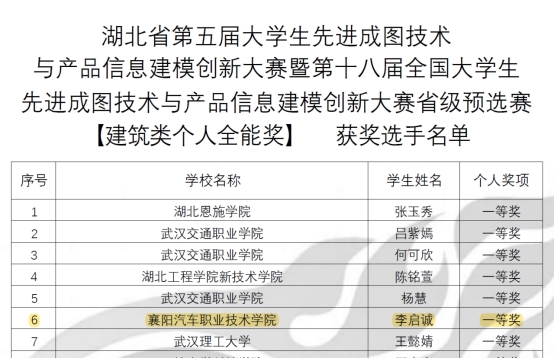 大赛以“德能兼修,技高一筹”为主题,每年举办一届,目的在于为中华民族全面复兴,为中国制造走向中国创造催生和助长大量优秀人才。大赛结合新工科建设和工程教育专业认证,设立机械、建筑、道桥、水利四个竞赛类别。作为国内“图学界奥林匹克”赛事,本次湖北省选拔赛参赛高校众多,其中不乏武汉大学、武汉理工大学等“985”“211”本科高校。建筑工程学院代表我校参与建筑类赛道竞赛,荣获个人全能赛一等奖3项、二等奖6项、三等奖2项,共获12名入围国赛名额,实现全员晋级国赛的新突破。