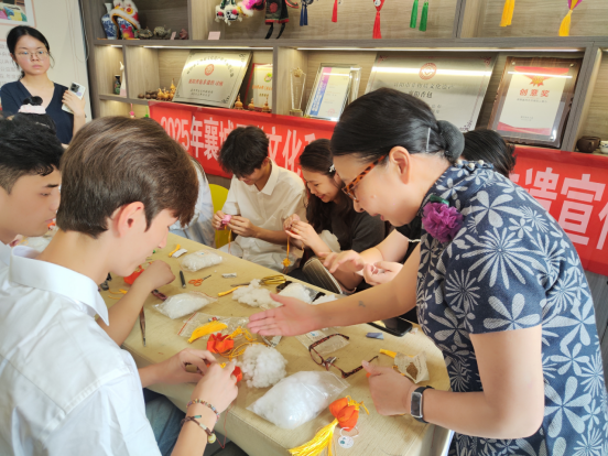 在襄阳香包非遗传习所,学生们近距离了解了省级非物质文化遗产项目——襄阳香包的制作工艺与文化内涵。非遗传承人崔明凡老师现场讲解香包的历史渊源与制作技巧,并指导学生体验香包缝制、填充香料等工序。来自维吾尔族的学生穆合表示:“香包的精美图案和独特寓意让我感受到中华传统文化的魅力,和同学们一起动手制作,更让我体会到各民族文化的交融与共鸣。”