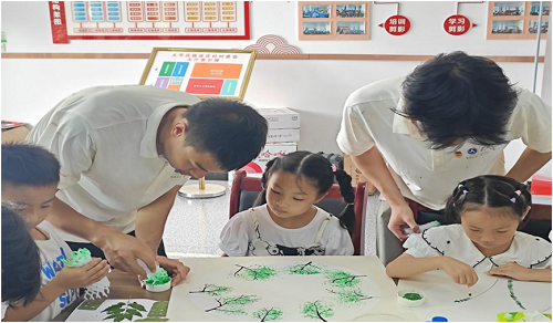 针对徐庄村的小朋友们,实践团开展了一场极具创意的手工制作活动。实践团因地制宜,带领小朋友们运用树叶、树枝等自然环保材料进行美育创作。活动中,小朋友们在实践团成员的指导下,充分发挥想象力,利用树棍和树叶制作出形态各异的机器人和精美的立体画等形式多样的作品,展现出徐庄村美丽的田园风光和特色产业;此外,实践团还准备了漆扇和专业的环保漆扇颜料,开展了新颖的漆扇创作环节,让孩子们在体验传统工艺的同时感受绿色材料的独特魅力。这与国家推动产业绿色转型、实现经济与生态协调发展的政策方向高度契合。小朋友们在快乐创作的过程中,不仅提升了动手能力和艺术素养,更在心中深深种下了绿色环保与热爱家乡的种子。