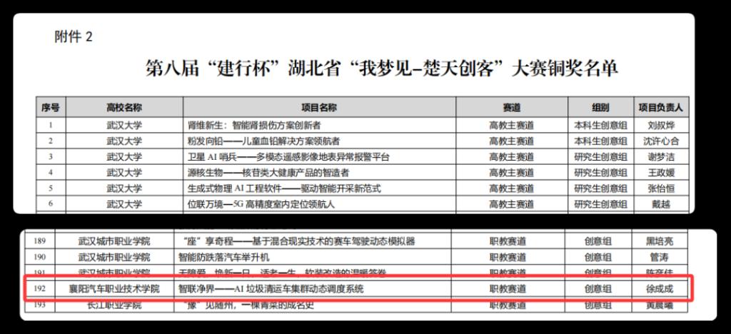 近日,“建行杯”第八届楚天创客大赛落幕,我校汽车工程学院汽车电子技术专业学生徐成成、吴远杰等学生从全省职校队伍中突围,斩获省赛职教赛道创意组铜奖,这是继该专业本学期1月获第十九届全国大学生智能汽车竞赛室外赛全国总决赛二等奖、6月获第十五届"挑战杯"大学生课外学术科技作品竞赛省赛三等奖后第3次获得学校重点鼓励赛项的重量级荣誉,彰显了汽车电子技术专业在教学和育人方面的卓越成效。