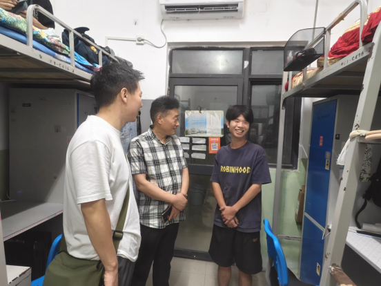 走访中,包科杰与同学们从新学期课程准备聊到日常作息安排,从饮食安全叮嘱到身心健康关怀,语气温和如春日暖阳,让初返校园的同学们倍感亲切。智能建造学院的领导老师们也同步了解着同学们的生活需求,细致记录下大家提出的建议,用务实行动为学子们筑牢校园“温暖港湾”。在1C416宿舍中,包科杰与智能建造学院的周阳同学展开了一场格外暖心的对话。当问及暑假生活,周阳同学略带腼腆却眼神坚定地分享,为减轻家庭负担,他整个暑假都在实习,凭借自身本领完成项目任务。聊到未来规划,周阳更是条理清晰地提及,已制定好详细的学习计划,既要巩固专业核心课程,也要加强英语能力提升,希望通过努力进一步深造,在智能建造领域实现更高理想。包科杰认真倾听着,不时点头赞许,对周阳同学自立自强的精神和清晰的人生规划给予高度肯定,鼓励该同学积极准备专升本,为美好明天奋斗。