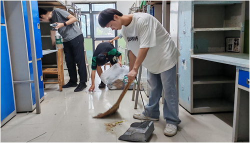 志愿者们分工协作,对宿舍进行全方位清洁。他们清扫地面、擦拭门窗、深度清洁卫生间,不放过任何卫生死角,让宿舍焕然一新。同时,志愿者们化身 “安全卫士”,仔细检查电器设备、门窗、床铺等设施,对电路进行初步检测,发现隐患及时上报并设置警示标识,联系专业人员处理。