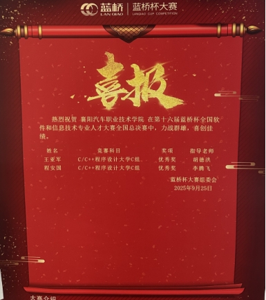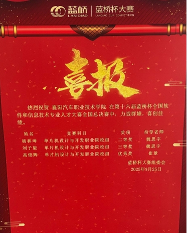 2025年10月28日,第十六届蓝桥杯全国软件和信息技术专业人才大赛全国总决赛获奖结果公布,襄阳汽车职业技术学院人工智能学院学子在本届赛事中表现亮眼,共斩获优秀奖3项、二等奖1项、三等奖1项,在单片机设计与开发、C/C++程序设计等领域展现出扎实的专业素养和创新能力。