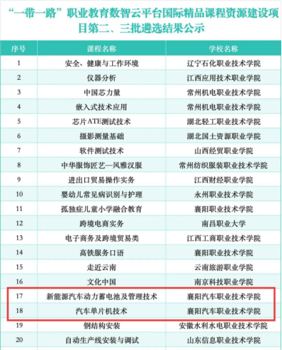 近日,从“一带一路”职业教育数智云平台国际精品课程资源建设项目组委会传来喜讯,襄阳汽车职业技术学院申报的《新能源汽车动力蓄电池及管理技术》《汽车单片机技术》两门课程,在全国34所高校56个项目的激烈竞逐中脱颖而出,成功入选项目第二、三批国际精品课程!这是学院在国际化课程建设领域取得的重要突破,更是行业与国际社会对学院课程建设质量、专业教学实力的高度认可。