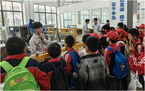 小记者们走进智能制造学院科普基地,近距离接触各类智能制造设备。在灯塔工厂模拟区,他们目睹数字孪生技术的流畅运行,感受工业机器人的精准操控;在3D工坊,观看专业设备演示,专业设备现场演示,志愿者深入浅出地讲解汽车制造的技术原理。学院“产教融合”的实训环境,使小记者直观领略智能制造的先进魅力,呼应“发展新质生产力,强化技能人才支撑”的时代强音。