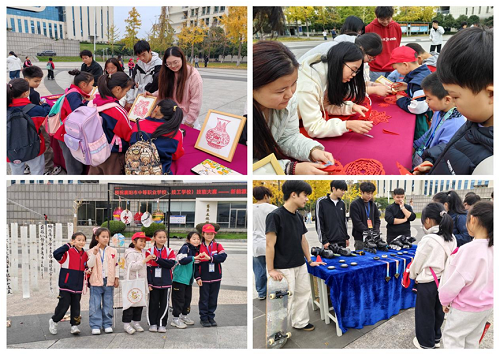 活动伊始,红旗广场上舞龙舞狮热闹开场,雄狮与小记者亲切互动,现场气氛热烈;太极表演如行云流水,引来阵阵模仿;滑板与轮滑表演则洋溢着青春活力,点燃全场热情。非遗展示区内,掐丝珐琅流光溢彩、剪纸艺术精巧细腻、漆扇工艺典雅动人,每一处都吸引大家驻足。志愿者们耐心指导小记者动手创作剪纸,孩子们手执剪刀专注裁剪,一件件充满童趣的作品在指尖诞生,传统艺术的魅力于互动中悄然流淌。