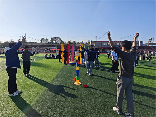 “不倒森林”要求每位队员扶杆移动并迅速接替前一位的杆位,保持所有杆子不倒。该项目既锻炼反应力,也强化团队责任感,生动诠释人际支持的意义——每个人既是受助者,也是他人的守护者。同学们在接力中体会到团队协作的力量。