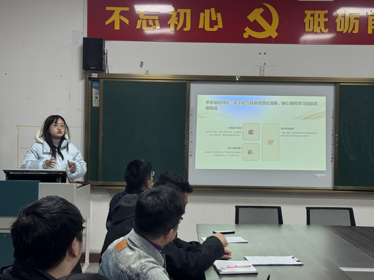 周楚阳老师以“构建‘三位一体’班级管理模式”为题,从思想引领、学风建设、实践育人三个维度展开分享。他介绍,通过建立“班委+宿舍长+班级特长生”责任体系,开展学业帮扶、专业技能竞赛等活动,让班级形成“比学赶超”的良好学风。