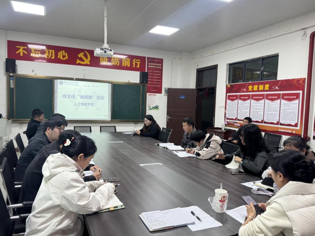 为进一步强化班级管理效能,搭建班主任经验交流平台,凝聚育人共识,11月23日,人工智能学院举办“班主任说班级”主题活动。人工智能学院院长胡德洪、副院长陈露及全体班主任、辅导员参与活动。5位班主任代表围绕班级建设实践、特色管理方法、育人案例分享等内容展开深入交流,分享经验,共话成长。