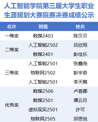 此次大学生职业规划大赛的成功举办,不仅提升了学生的职业规划意识与就业核心竞争力,也为学院深化人才培养改革、促进产教融合搭建了有效平台。下一步,人工智能学院将持续开展职业规划指导、简历优化、模拟面试等系列活动,助力青年学生在职业生涯中精准定位、稳步前行,为人工智能行业高质量发展输送更多高素质应用型人才。