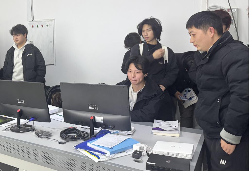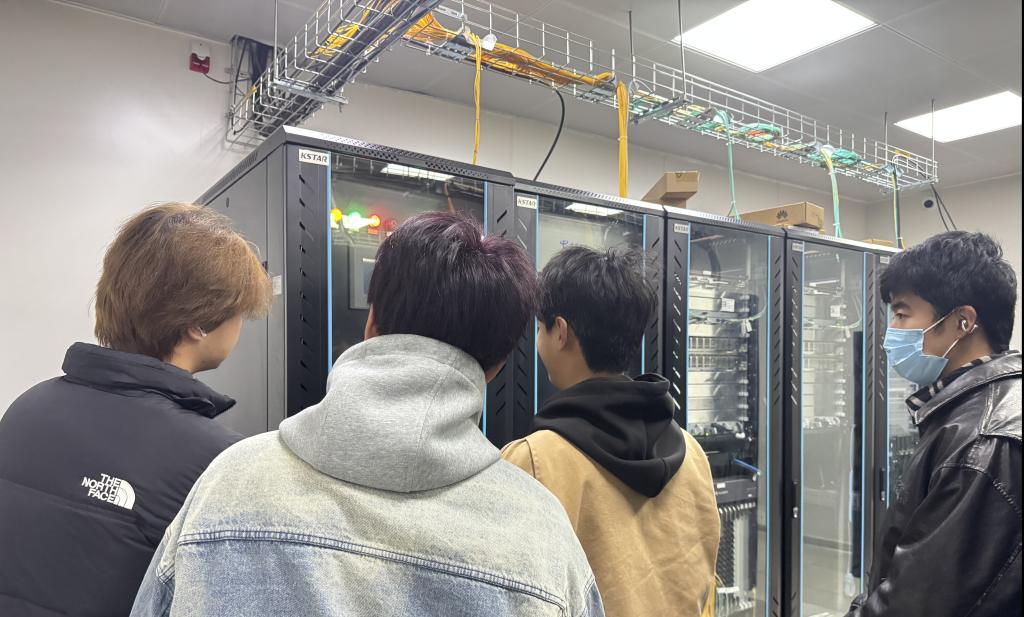 接着,物联网2506班同学在中国电信吴工程师的带领下参观了学校中心机房。工程师为同学们演示了校园网总体设计网络拓扑、校园网有线/无线网络设计及测验网络运维管理设计,并且请学生代表上前实战,同学们亲自感受到基于F5G-A万兆全光网架构的崭新底座技术。