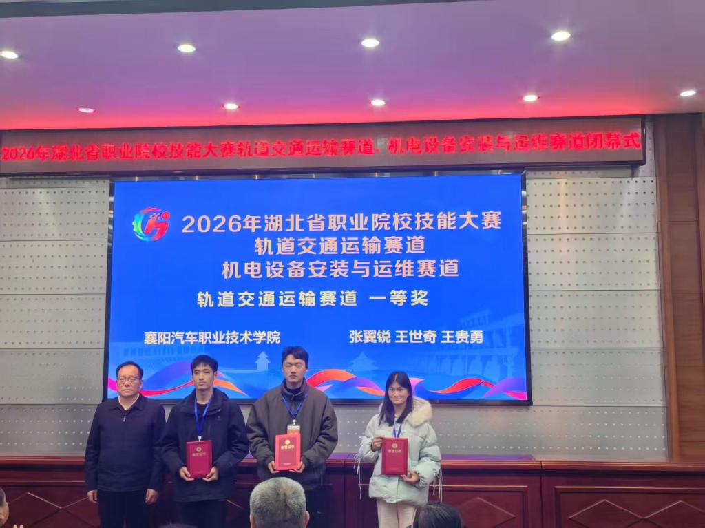 近日,由湖北省教育厅主办、武汉铁路职业技术学院承办的2026年湖北省职业院校技能大赛轨道交通运输赛道圆满收官。我校由王贵勇、张翼锐、王世奇三名同学组成的参赛团队斩获金奖。