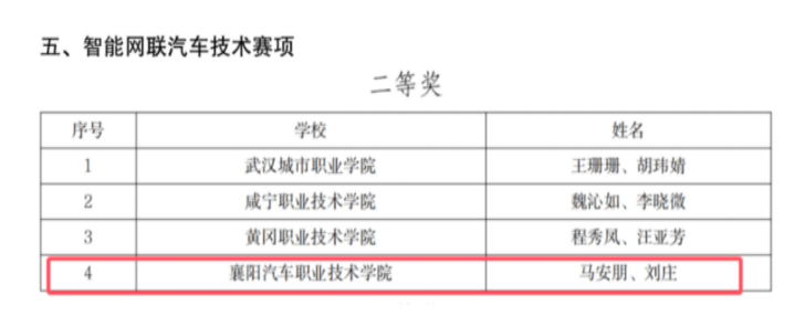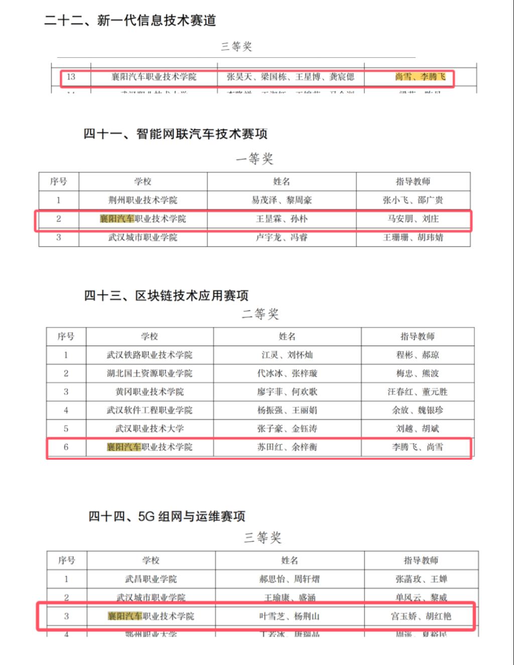 新一代信息技术赛道:张昊天、梁国栋、王星博、龚宸偲(指导教师尚雪、李腾飞)参赛获三等奖;智能网联汽车技术赛项:王昰霖、孙朴(指导教师马安朋、刘庄)参赛获一等奖;区块链技术应用赛项:苏田红、余梓衡(指导教师李腾飞、尚雪)参赛获二等奖;5G组网与运维赛项:叶雪芝、杨荆山(指导教师宫玉娇、胡红艳)参赛获三等奖。