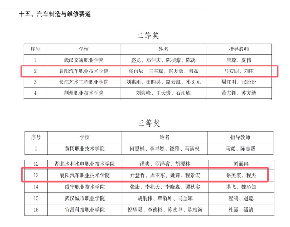 高职学生组中,汽车制造与维修赛道:杨雨辰、王雪瑶、赵万墩、陶磊(指导教师马安朋、刘庄)获二等奖;亓慧哲、周亚东、姚辉、程景宏(指导教师张美霞、程杰)获三等奖。