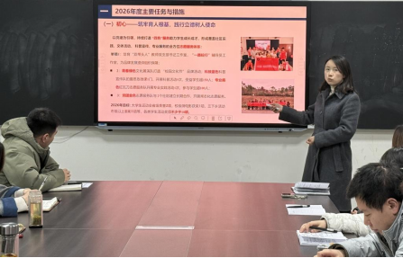 在明确方向后,学院领导班子立足分管领域,系统汇报了2026年度工作思路与具体举措。学管副院长王颖坤提出,持续打造“四色”志愿服务体系,培育“双带头人”教师党支部书记工作室和“一路砼行”辅导员工作室,通过“青春绿色”文化展演、“科技蓝色”科普宣传、“专业底色”红瓦刀服务、“党团金色”社区共建,全方位助力学生成长成才。