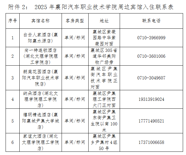 附件2:2025年襄阳汽车职业技术学院周边宾馆入住联系表