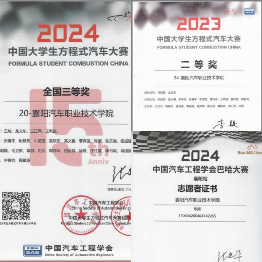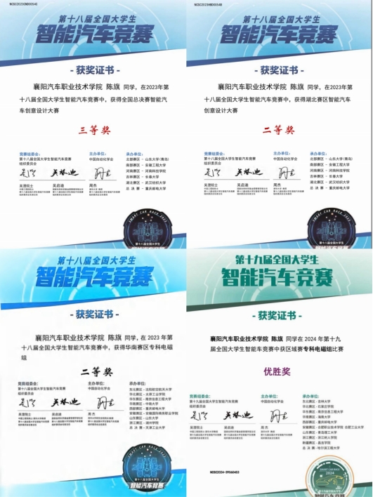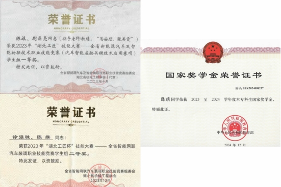 在校期间,陈旗始终以“技术深耕者”的标准要求自己,专业成绩稳居年级第一,荣获2024年度国家奖学金,还获得“2023中国大学生方程式汽车大赛二等奖”“2023年湖北工匠技能大赛——全省新能源汽车及智能物联技术职业技能竞赛(汽车智能座舱关键技术应用赛项)学生组一等奖”“2023年湖北工匠杯技能大赛——全省智能网联汽车装调职业技能竞赛学生组二等奖”“2023年第十八届全国大学生智能汽车竞赛全国总决赛‘智能汽车创意设计大赛’三等奖”等荣誉。