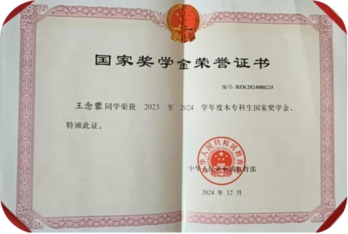 国家奖学金的荣耀:凭借优异的学业成绩和全面的综合素质,王念蓉荣获国家奖学金,成为同学们眼中的学霸和榜样。