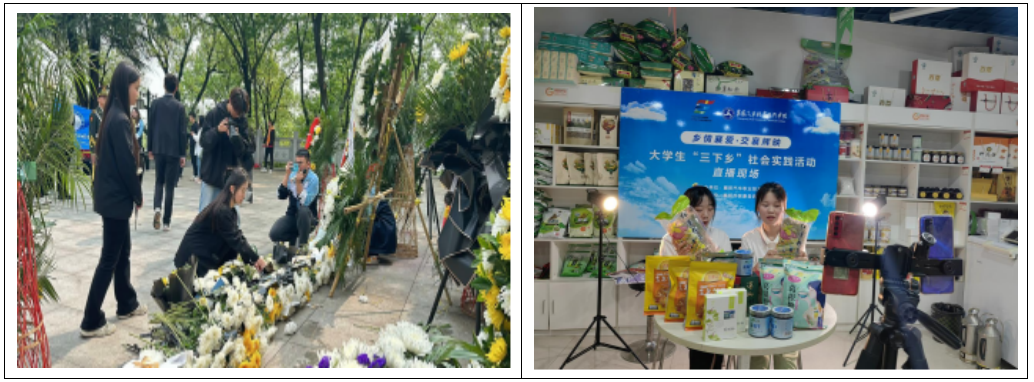 左图为王念蓉正在为革命烈士献花,右图为王念蓉参加暑期三下乡社会实践