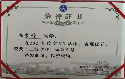 入学以来,杨梦婷始终坚守“遵纪守法、正直向上”的准则,以热爱学习、全面发展的姿态脱颖而出。作为班级学习委员,她不仅自身刻苦钻研专业知识,还主动组织学习交流活动,带动同学们共同进步,用责任与担当赢得师生认可。她积极参与各类校园实践,作为第七届全国大学生艺术节志愿者贡献力量,更斩获襄阳汽车职业技术学院2023-2024年度“三好学生”称号、国家励志奖学金等荣誉,用实绩书写校园精彩。