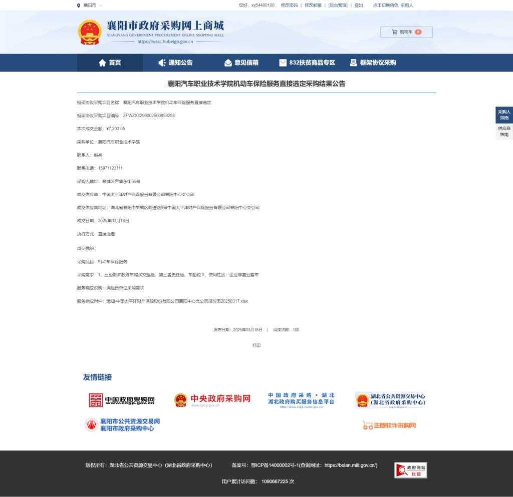 襄阳汽车职业技术学院机动车保险服务网上商城采购结果公告