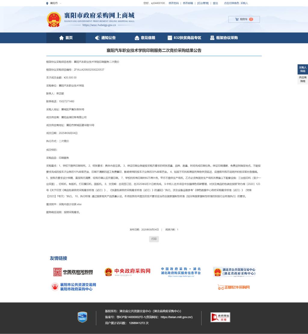 襄阳汽院学校发展成果印刷服务二次竞价采购结果公告