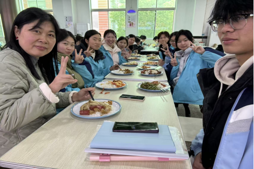 (图为刘建萍老师与班级学生在食堂一起就餐)