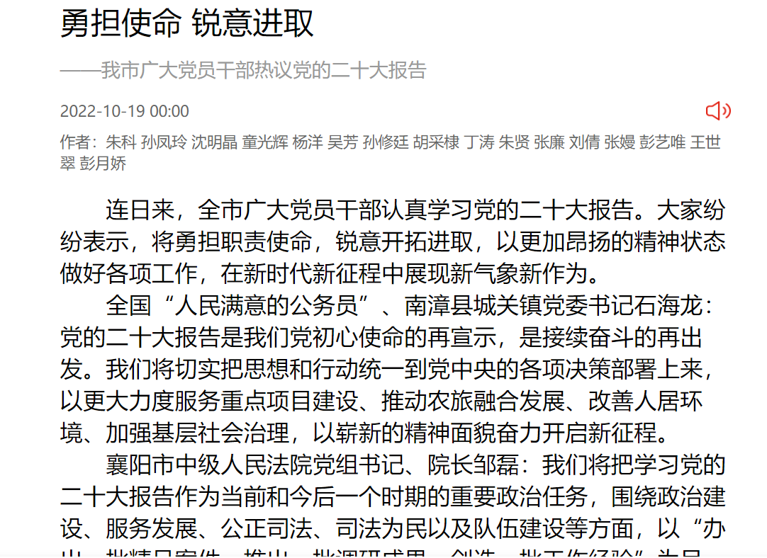 襄阳市中级人民法院党组书记、院长邹磊:我们将把学习党的二十大报告作为当前和今后一个时期的重要政治任务,围绕政治建设、服务发展、公正司法、司法为民以及队伍建设等方面,以“办出一批精品案件、推出一批调研成果、创造一批工作经验”为目标,加快建设先进法院。