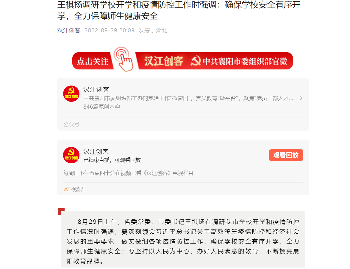 8月29日上午,省委常委、市委书记王祺扬在调研我市学校开学和疫情防控工作情况时强调,要深刻领会习近平总书记关于高效统筹疫情防控和经济社会发展的重要要求,做实做细各项疫情防控工作,确保学校安全有序开学,全力保障师生健康安全;要坚持以人民为中心,办好人民满意的教育,不断擦亮襄阳教育品牌。