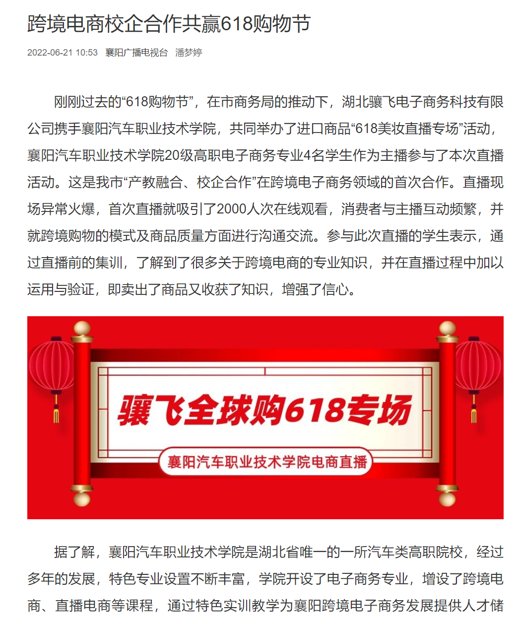 据了解,襄阳汽车职业技术学院是湖北省唯一的一所汽车类高职院校,经过多年的发展,特色专业设置不断丰富,学院开设了电子商务专业,增设了跨境电商、直播电商等课程,通过特色实训教学为襄阳跨境电子商务发展提供人才储备。
