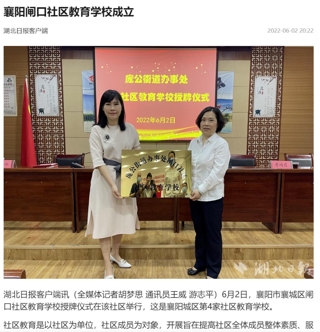 湖北日报客户端讯(全媒体记者胡梦思 通讯员王威 游志平)6月2日,襄阳市襄城区闸口社区教育学校授牌仪式在该社区举行,这是襄阳城区第4家社区教育学校。