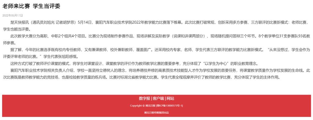 楚天快报讯(通讯员刘旭光记者胡梦思)5月14日,襄阳汽车职业技术学院2022年教学能力比赛落下帷幕。此次比赛打破常规,创新采用多方参赛、三方联评的比赛新模式:老师比赛,学生也能当评委。