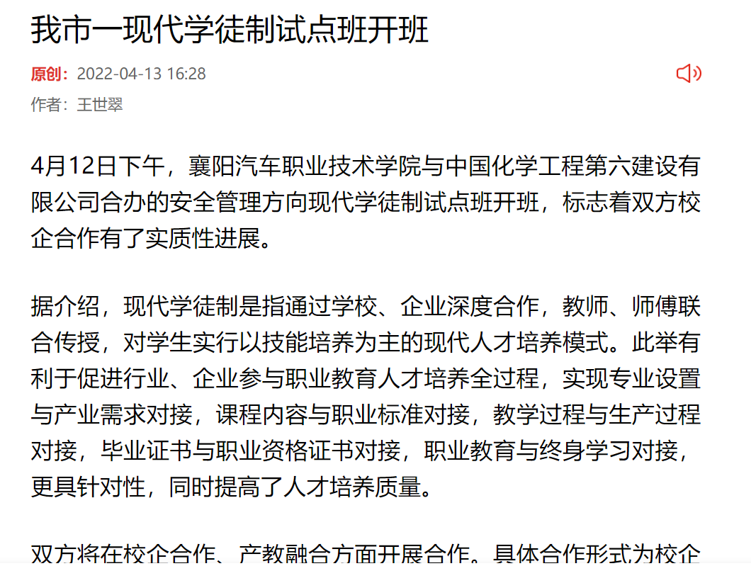 4月12日下午,襄阳汽车职业技术学院与中国化学工程第六建设有限公司合办的安全管理方向现代学徒制试点班开班,标志着双方校企合作有了实质性进展。