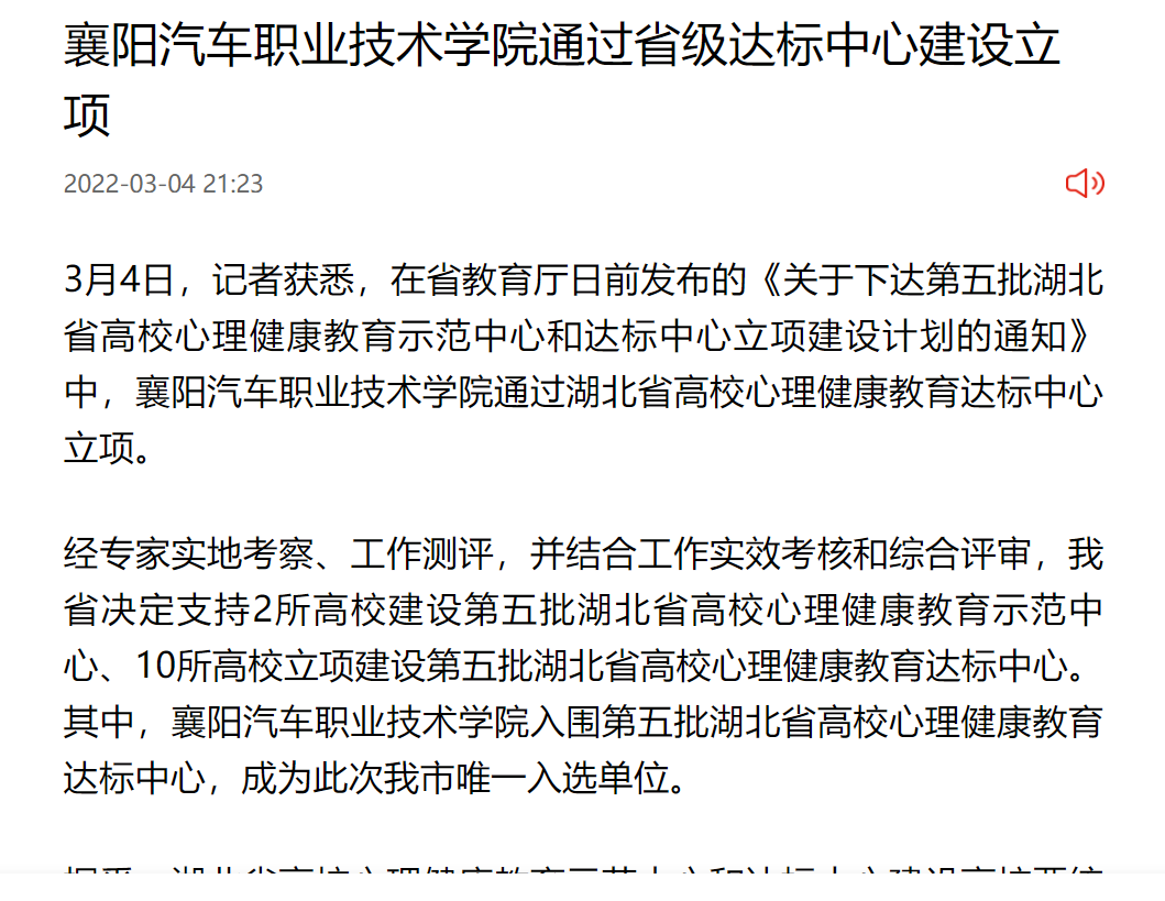 经专家实地考察、工作测评,并结合工作实效考核和综合评审,我省决定支持2所高校建设第五批湖北省高校心理健康教育示范中心、10所高校立项建设第五批湖北省高校心理健康教育达标中心。其中,襄阳汽车职业技术学院入围第五批湖北省高校心理健康教育达标中心,成为此次我市唯一入选单位。
