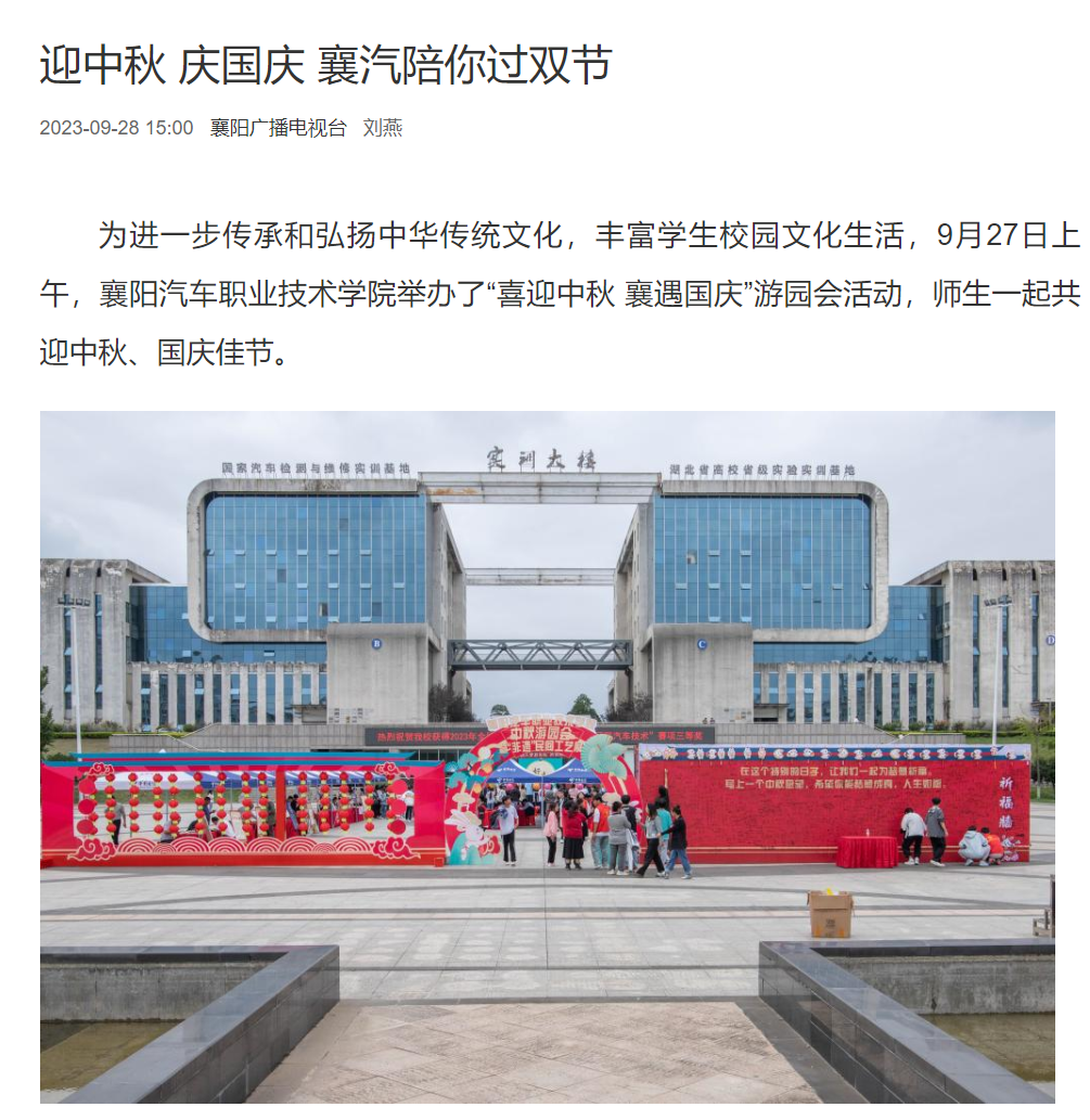 为进一步传承和弘扬中华传统文化,丰富学生校园文化生活,9月27日上午,襄阳汽车职业技术学院举办了“喜迎中秋 襄遇国庆”游园会活动,师生一起共迎中秋、国庆佳节。