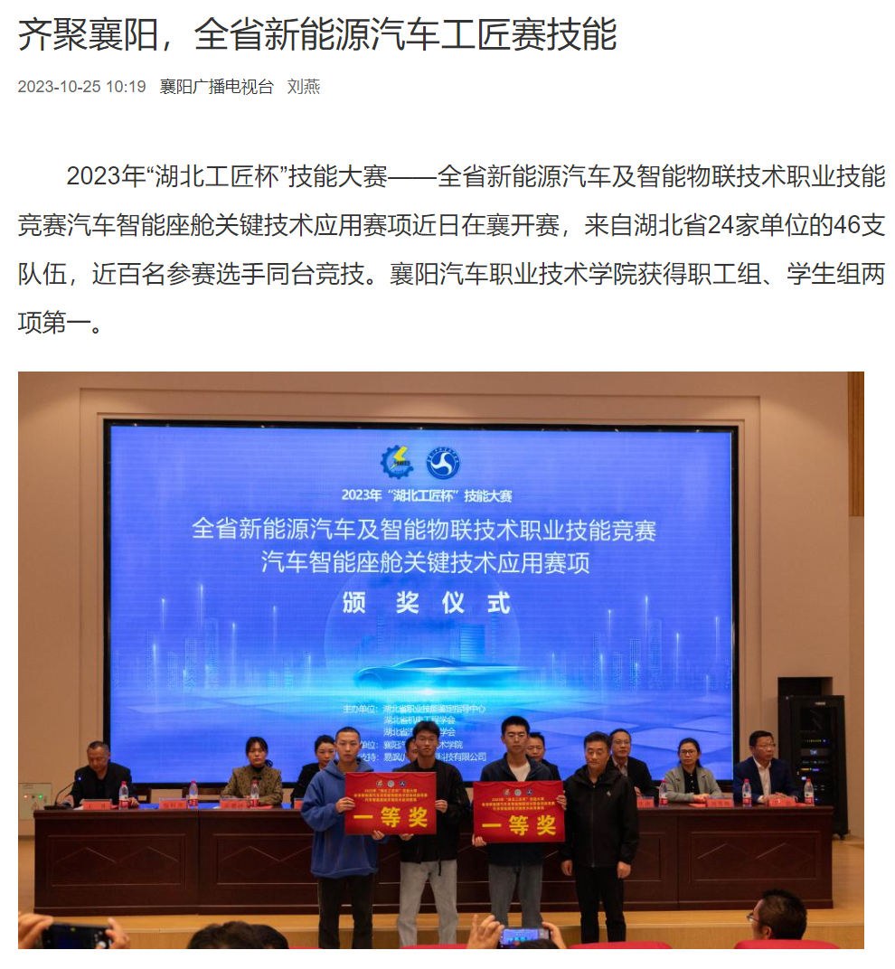 2023年“湖北工匠杯”技能大赛——全省新能源汽车及智能物联技术职业技能竞赛汽车智能座舱关键技术应用赛项近日在襄开赛,来自湖北省24家单位的46支队伍,近百名参赛选手同台竞技。襄阳汽车职业技术学院获得职工组、学生组两项第一。