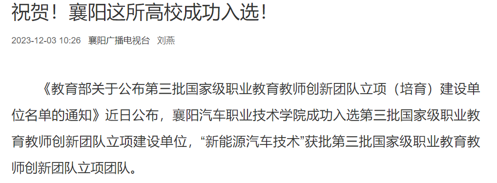 《教育部关于公布第三批国家级职业教育教师创新团队立项(培育)建设单位名单的通知》近日公布,襄阳汽车职业技术学院成功入选第三批国家级职业教育教师创新团队立项建设单位,“新能源汽车技术”获批第三批国家级职业教育教师创新团队立项团队。