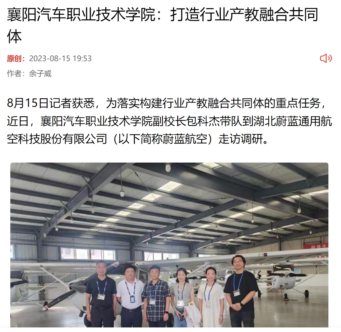 8月15日记者获悉,为落实构建行业产教融合共同体的重点任务,近日,襄阳汽车职业技术学院副校长包科杰带队到湖北蔚蓝通用航空科技股份有限公司(以下简称蔚蓝航空)走访调研。