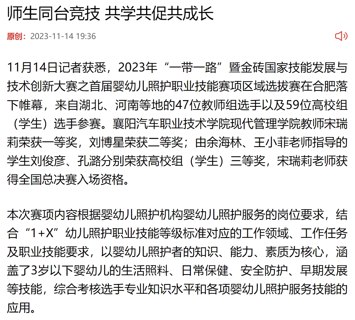 11月14日记者获悉,2023年“一带一路”暨金砖国家技能发展与技术创新大赛之首届婴幼儿照护职业技能赛项区域选拔赛在合肥落下帷幕,来自湖北、河南等地的47位教师组选手以及59位高校组(学生)选手参赛。襄阳汽车职业技术学院现代管理学院教师宋瑞莉荣获一等奖,刘博星荣获二等奖;由余海林、王小菲老师指导的学生刘俊彦、孔潞分别荣获高校组(学生)三等奖,宋瑞莉老师获得全国总决赛入场资格。